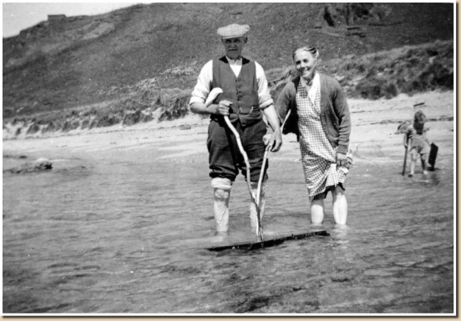 Grampa, Grandma and Neil paddling at Shell Bay 1950